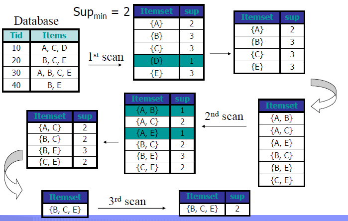 - Apriori 알고리즘이 극복해야 하는 부분은 1) 데이터베이스를 여러번 스캔해야 하는 점 2) 후보군이 너무 많다는 점이다.