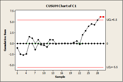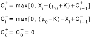- If either C+ or C- exceeds the decision interval H (a common choice H=5σ), the process is considered to be out of control