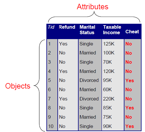 - Data set 은 data objects로 이루어져 있고 data object는 entity 를 표현한다.