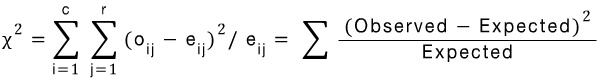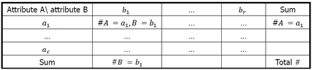 e (i,j) is expected frequency : 예측값, e (i,j) = #(A = ai) * #(B=bi) / n , (행의합x열의합)/전체수