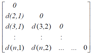 A triangular matix, i.e., d(i,j) = d(j,i)