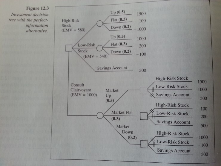 Consult Clairvoyant, 즉, perfect information 이 제공되는 경우, investor의 행동을 보면 market이 up 일때는 high rist stock을, market이 flat일때는 savings account로 500을 마지막으로 market이 down 일때도 savings account로 500의 수익을 얻는다. 이 경우 EMV는 1000이다.