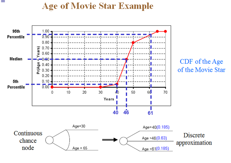 Decision Tree 에서 Continuous chance node 가 세가지 포인트를 가진 Discrete Approximation 으로 바뀐다.