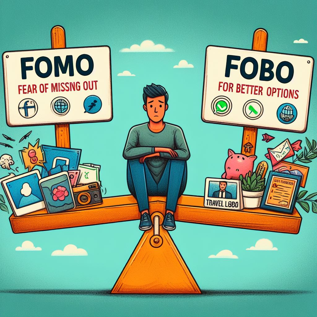 예를 들어, 어떤 사람은 새로운 일자리를 찾아볼 때 FOBO를 느낄 수 있습니다. 다양한 일자리 옵션이 있을 때, 더 나은 선택지가 있을지도 모른다는 두려움 때문에 결정을 내리지 못하고 미루게 됩니다. 동시에 이 사람은 다른 사람들이 좋아하는 일자리를 놓치는 것을 두려워하며 FOMO를 느낄 수도 있습니다.