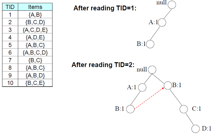 - 먼저 각각의 item 이, 1-itemset, 의 support count 를 계산하고 가장 높은 item 부터 정렬하는 것이 FP tree 의 작성의 포인트