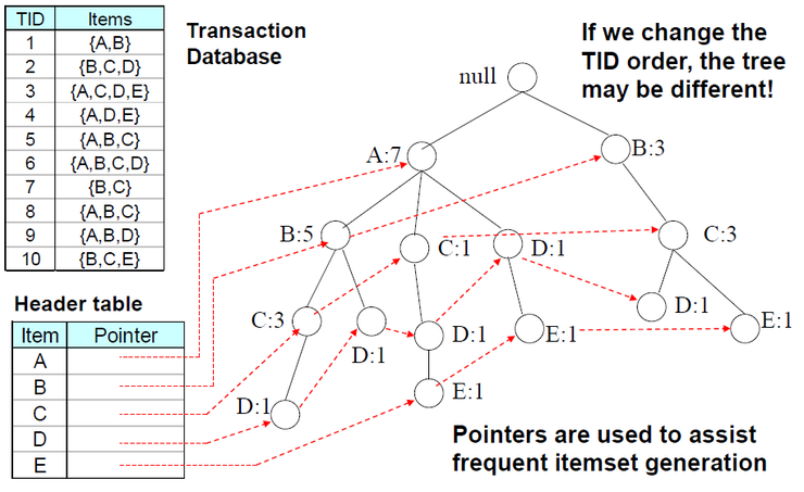 - 먼저 각각의 item 이, 1-itemset, 의 support count 를 계산하고 가장 높은 item 부터 정렬하는 것이 FP tree 의 작성의 포인트