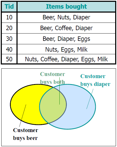 예를 들어 sup(Beer, Diaper) = 3, 맥주와 기저귀를 동시에 구매한 횟수는 3이다.