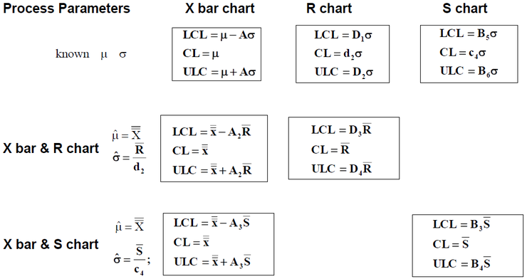 - S chart에서 variable sample size 일 때, A3, B3 and B4 는 각 sample size에 대응하는 값을 사용한다.