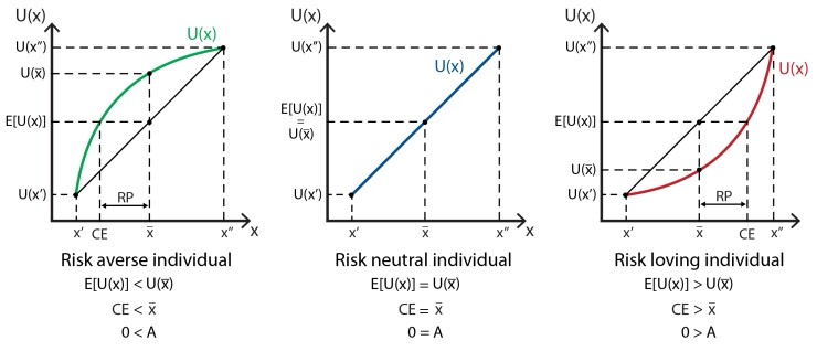 여기서 risk premium은 CE(certainty equivalent)에서 수직으로 그은 선과 U(x)가 만나는 점의 y절편인 E(U(x)) : expected utility 의 값에서 x축으로 평행인 점선과 x-bar에서 수직으로 그은 선이 만나는 점의 차이.. (허접한 설명이네요) 즉, (x-bar) - (CE) 의 값이 됩니다. (그래프에서 RP로 표시된 부분). 따라서, risk averse한 사람은 항상 양의 값을 그리고 risk seeker는 항상 음의 리스크 프리미엄의 값을 가지게 됩니다. 직관적을 생각해보면 위험회피 성향을 가지는 사람은 확률적으로 100을 벌 수 있다면, 확실한 70을 받고 100을 벌 기회를 파는 것이고, 위험선호 성향을 가진 사람을 70으로 100의 기회를 노리는 것이라고 볼 수 있습니다. (사진출처 http://www.policonomics.com)